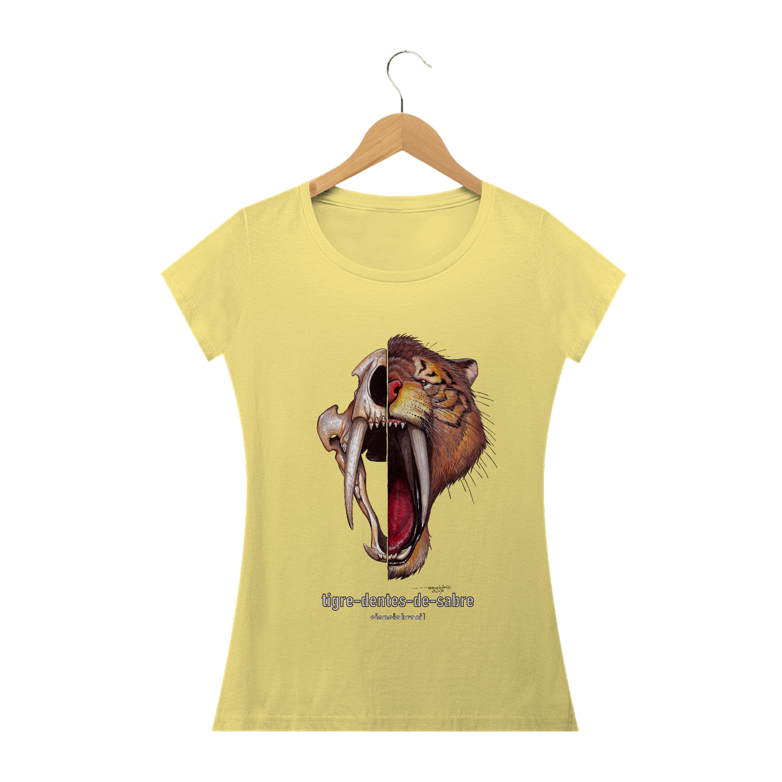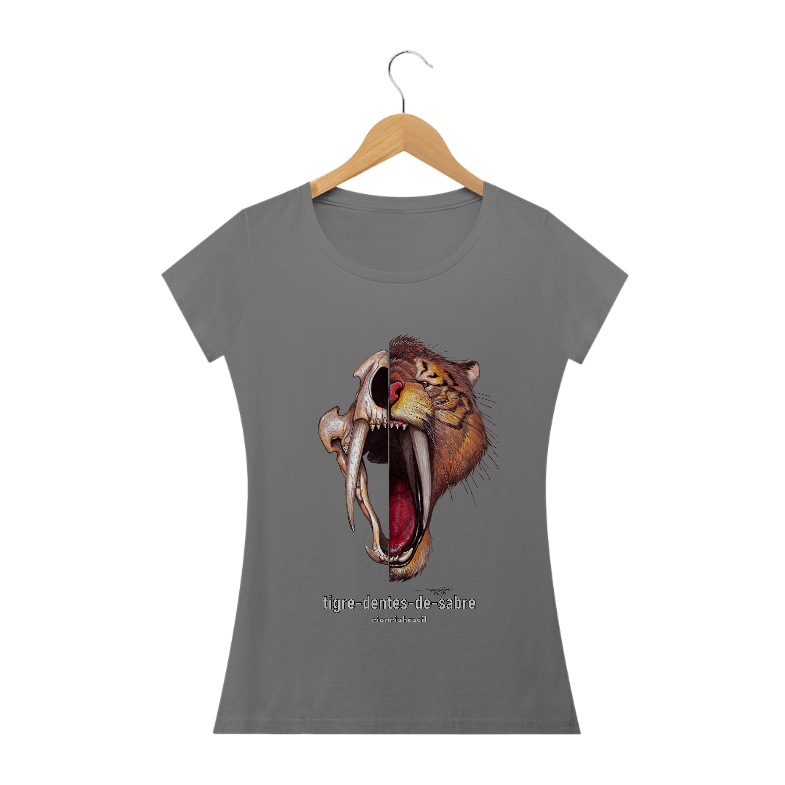 Mais legal ainda é poder usar esta linda camiseta com a ilustração do nosso tigre-dentes-de-sabre.